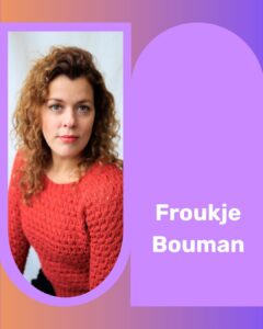 Froukje Bouman is actrice, (stand-up)comedian en moeder, allemaal met wisselend succes. Ze woont onder de gifwolk van Tata Steel, maar weet dat te compenseren met yoga, haverlattes en oppervlakkig ademen.Ze kan verdrinken in haar dagelijkse first world problems, maar ligt wakker van de ongelijkheid in de wereld. Om dit alles beter te maken, werkt ze aan een boek over spinnen en mensen, want dat is wat de wereld nu nodig heeft.